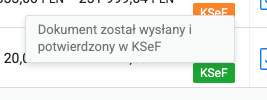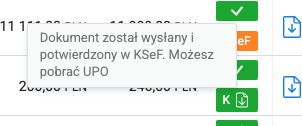 • Dokument wysłany i potwierdzony w KSeF – masz pewność, że dokument został poprawnie przyjęty, a dodatkowo po kliknięciu w ikonę statusu możesz pobrać UPO (Urzędowe Poświadczenie Odbioru).