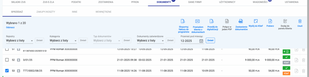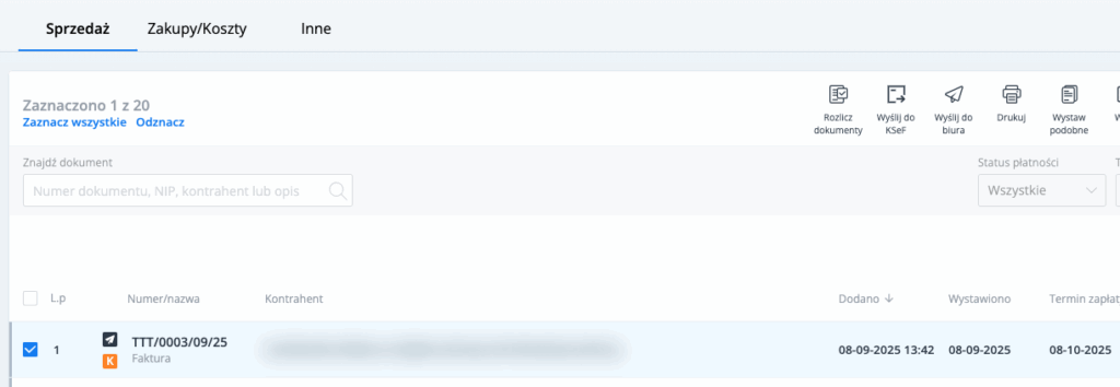 Po zaznaczeniu faktury na liście dokumentów pojawia się opcja „Wyślij do KSeF„.
