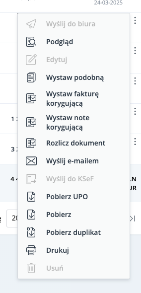 Przy fakturach wysłanych do KSeF i potwierdzonych, po wejściu kliknięciu w trzy kropki na liście faktur można pobrać UPO.