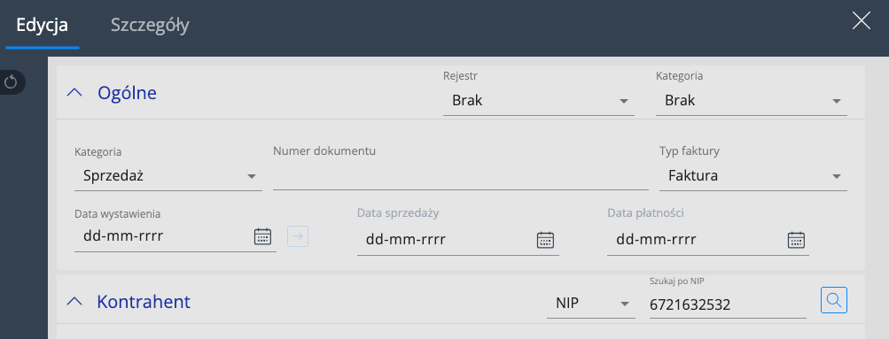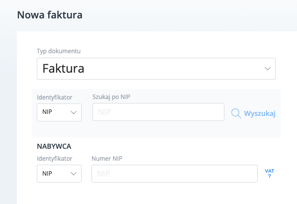 Zmieniliśmy nieco widok wyszukiwania danych kontrahenta, chcieliśmy podkreślić i oddzielić wizualnie tę opcję, funkcjonalność pozostaje taka sama. Dodatkowo dodaliśmy wyszukiwanie po numerze KRS. W zależności od wybranego identyfikatora wyszukujemy dane w bazie GUS lub VIES.