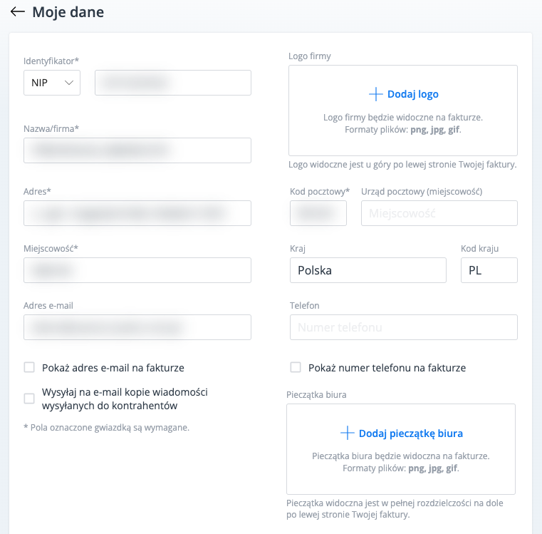 Klient biura wystawiający fakturę, może dodać swoją pieczątkę, która pojawi się na wygenerowanym dokumencie. Pieczątkę można ustawić w sekcji Moje dane.