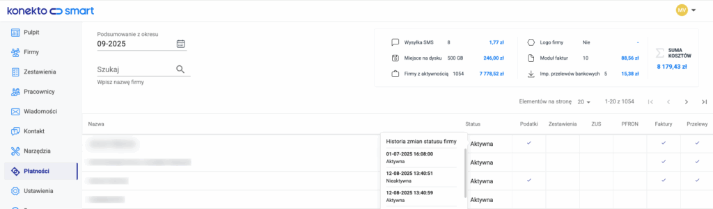 W panelu biura księgowego dodaliśmy dedykowaną zakładkę „Płatności” z przejrzystą tabelą i szczegółami należności za KonektoSmart. Po najechaniu myszą na status firmy (aktywna/nieaktywna), możemy zobaczyć historię aktywności danej firmy.